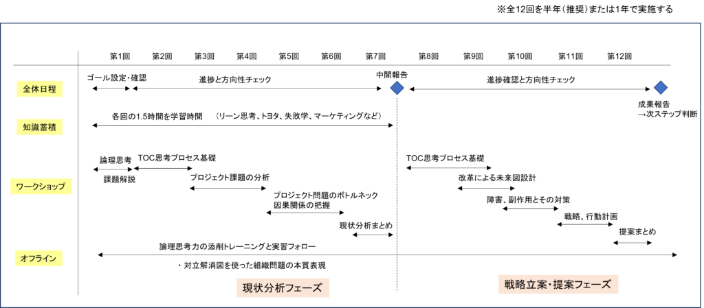 全12回(4時間/回、または5時間/回)を基本構成とします。(+トップ報告2回)